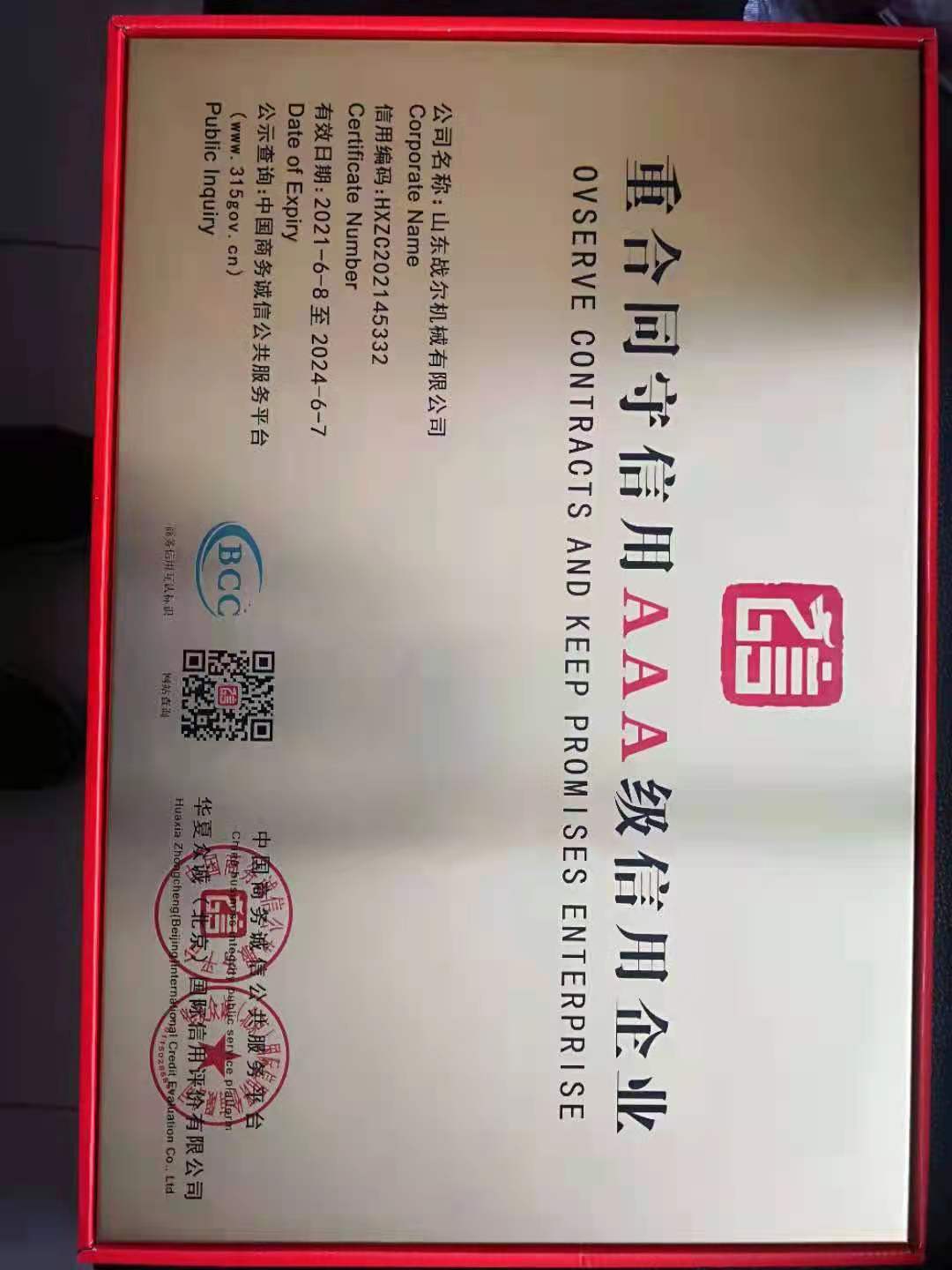 重合同守信用AAA级信用企业